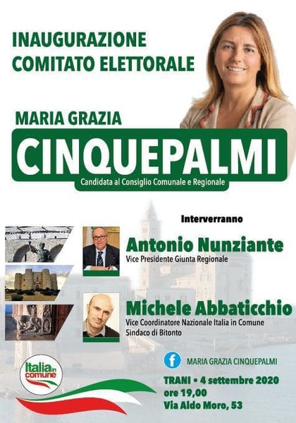 Avrà luogo oggi, venerdì 4 settembre, alle 19, in via Aldo Moro 53, l'inaugurazione del comitato elettorale di Maria Grazia Cinquepalmi, candidata al consiglio regionale e comunale. Interverranno Antonio Nunziante, vice presidente della giunta regionale, e Michele Abbaticchio sindaco di Bitonto e vice coordinatore nazionale di Italia in comune.