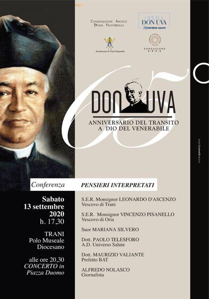 Si svolgerà il 13 Settembre con inizio alle ore17,30 nella sala convegni del Polo Museale di Trani sito in piazza Duomo la prima Conferenza dibattito "Pensieri Interpretati"dedicata al carismatico don Pasquale Uva, fondatore della «Casa della Divina Provvidenza di Bisceglie»