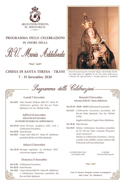 Si concludono oggi, martedì 15 settembre, a cura dell’arciconfraternita dell'Addolorata, le celebrazioni in vista della memoria liturgica di oggi, in programma presso la chiesa di Santa Teresa, in piazza Sedile San Marco.