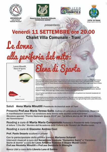 Oggi, venerdì 11 settembre, alle 20 nello Chalet della villa comunale verrà presentato "Le donne alla periferia del mito: Elena di Sparta" di Loreta Minutilli.