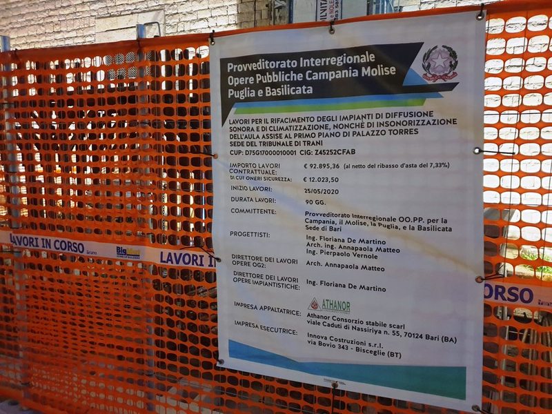 Si tratta di un intervento disposto dal Provveditorato interregionale delle opere pubbliche di Campania, Molise, Puglia e Basilicata per il «Rifacimento degli impianti di diffusione sonora e climatizzazione, nonché insonorizzazione della aula di Corte d'Assise al primo piano di Palazzo Torres, sede del Tribunale di Trani». L'importo contrattuale dei lavori, al netto del ribasso d'asta del 7,33 per cento, è di poco più di 92mila euro, le opere sono iniziate lo scorso 25 maggio e la durata dei lavori era stata prevista in 90 giorni.