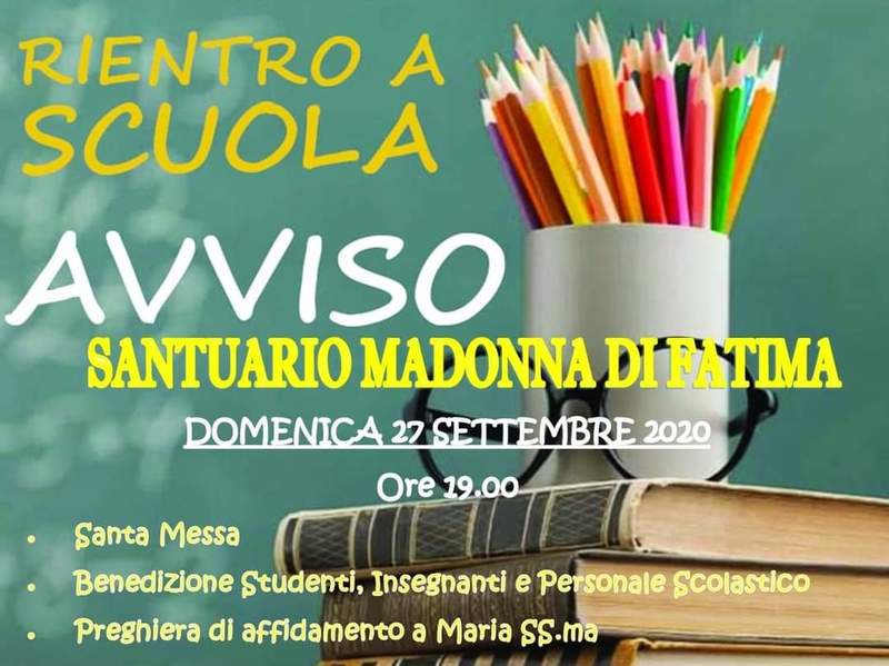In questo clima che alterna speranze e timori, fede e tentativi di ritorno alla normalità, si presenta la celebrazione di domenica 27 alle 19 presso il Santuario della Madonna di Fatima a Trani. La Santa Messa cin la benedizione degli studenti, dei docenti e di tutto il personale della scuola, con la contestuale preghiera di affidamento a Maria. Un momento di preghiera e riflessione, per ritrovarsi insieme, pronti ad affrontare questo particolare anno scolastico 2020/2021.