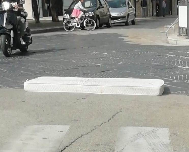Infatti, sempre a causa del forte vento di stamani, intorno alle 11 è volato per strada un materasso ed esattamente all'incrocio fra via piazza della Repubblica, via delle Crociate, via Cavour e via Mario Pagano.