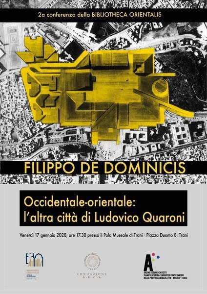 La Bibliotheca Orientalis - Attilio Petruccioli, la Fondazione S.E.C.A. e il Polo Museale di Trani presentano la seconda conferenza di architettura e urbanistica sul tema dell’incontro tra le culture: "Filippo De Dominicis Occidentale-orientale: l’altra città di Ludovico Quaroni". L'appuntamento è per domani, venerdì 17 gennaio, alle ore 17.30, al polo museale in piazza Duomo.