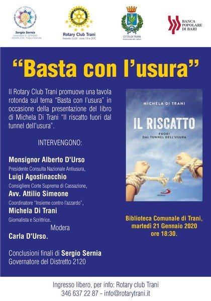 "Basta con l'usura". Questo è il titolo della tavola rotonda promossa dal Rotary Club Trani. Sarà questa l'occasione per presentare il libro di Michela di Trani "Il riscatto fuori dal tunnel dell'usura".