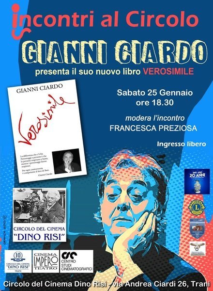 Sabato 25 gennaio alle ore 18.30 il circolo del cinema Dino Risi ospiterà Gianni Ciardo per la presentazione del suo nuovo libro "Verosimile" (edizione Line-o-type). L'evento, organizzato con le associazioni CorteSveva (Andria), il Lions Club e la Croce Bianca di Trani, sarà moderato da Francesca Preziosa.