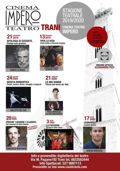 “Quanti strumenti ci sono per percepire la cultura?” Per rispondere a questa domanda Ergo Sum Produzioni presenta, a Trani, la seconda edizione di “Metti un libro a teatro”, programma stagionale teatrale 2019 – 2020, una stagione trasversale e multidisciplinare fatta di prosa, di danza, di musica e di Jazz che si svolgerà dal 28 novembre al 17 aprile al Cinema Teatro Impero.