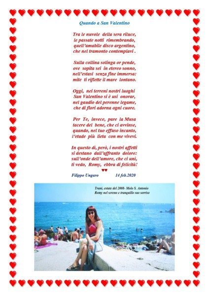 «Ispirandomi al giorno della memoria liturgica di S. Valentino Martire - scrive il prof. Filippo Ungaro - dedico i versi seguenti a coloro che, pur avendo quotidianamente vicini, materialmente e spiritualmente, i loro cari, non sono, a volte, del tutto consapevoli di quale prezioso