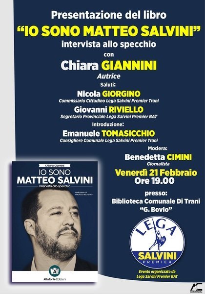 "Io sono Matteo Salvini" il libro-intervista al leader della Lega, con prefazione di Maurizio Belpietro, sarà presentato a Trani dall'autrice Chiara Giannini, presso la biblioteca comunale "G. Bovio" venerdì 21 Febbraio alle ore 19. Ad organizzare il dibattito il coordinamento provinciale e cittadino della Lega per Salvini Premier. Dopo i saluti del commissario cittadino della Lega Nicola Giorgino e del segretario provinciale Giovanni Riviello, sarà il consigliere comunale della Lega Emanuele Tomasicchio ad introdurre la giornalista Chiara Giannini.