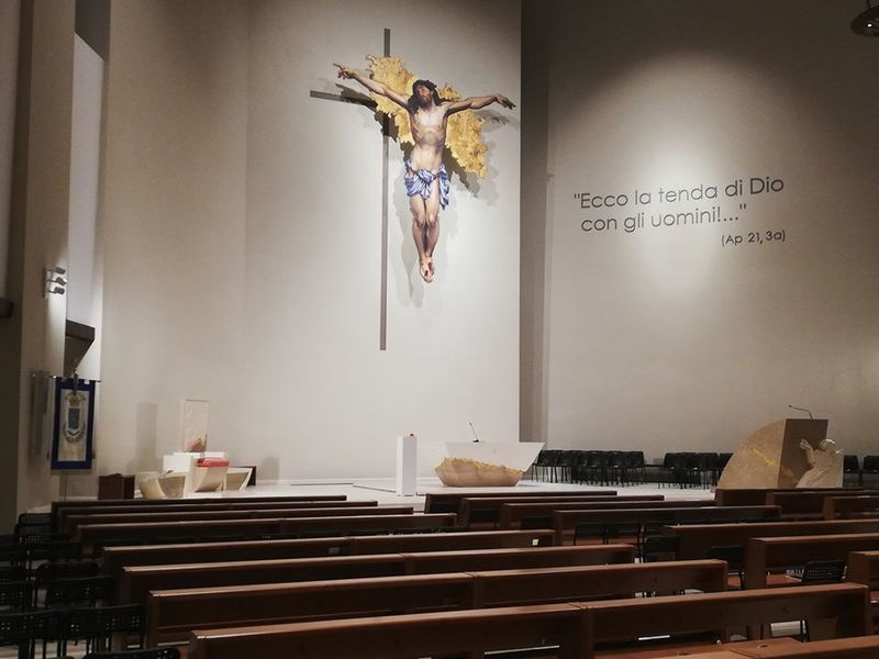 È una citazione dell'Apocalisse ad adornare la parete che fa da sfondo alla nuova chiesa parrocchiale di San Magno. Fa parte del capitolo 21, in cui Giovanni scrive testualmente: «Ecco la tenda di Dio con gli uomini. Egli abiterà con loro ed essi saranno suoi popoli ed Egli sarà il Dio con loro, il loro Dio».