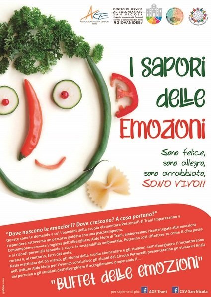 Da Febbraio a Marzo, l’A.Ge. Trani (associazione italiana genitori) organizza “I sapori delle emozioni”, un ciclo di incontri e laboratori rivolto agli studenti della scuola elementare Petronelli – Cezza e dell’Alberghiero Aldo Moro di Trani. Il progetto è promosso dal centro di servizio al volontariato San Nicola con il concorso #GIOVANIDEE.