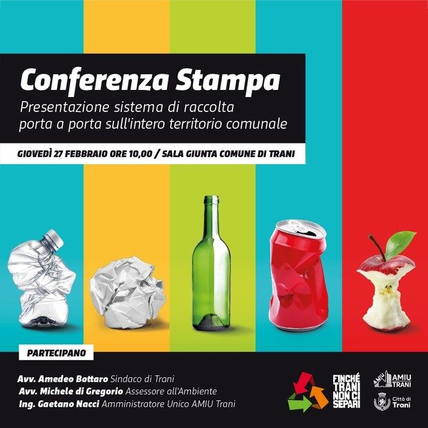 Il sindaco di Trani, Amedeo Bottaro, l’assessore all’ambiente, Michele di Gregorio, e l’amministratore unico di Amiu, Gaetano Nacci, incontrano oggi, giovedì 27 febbraio, alle ore 10, presso Palazzo di città, (sala giunta) gli operatori dell’informazione per comunicare le modalità di avvio del nuovo sistema di raccolta differenziata “porta a porta” sull’intero territorio comunale.