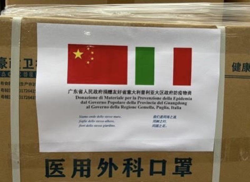 Sono arrivate 100mila mascherine chirurgiche donate alla Regione Puglia da parte del Governatore della Provincia del Guandgong Ma Xingrui. E altre 100mila mascherine chirurgiche sono arrivate dal Distretto di Futian.