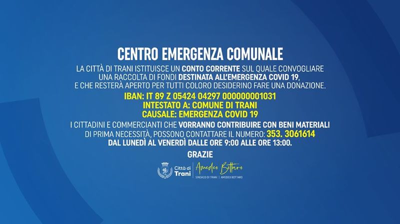 La Città di Trani ha istituito un conto corrente sul quale convogliare una raccolta di fondi destinata all’emergenza Covid-19 e che resterà aperto per tutti coloro desiderino fare una donazione.