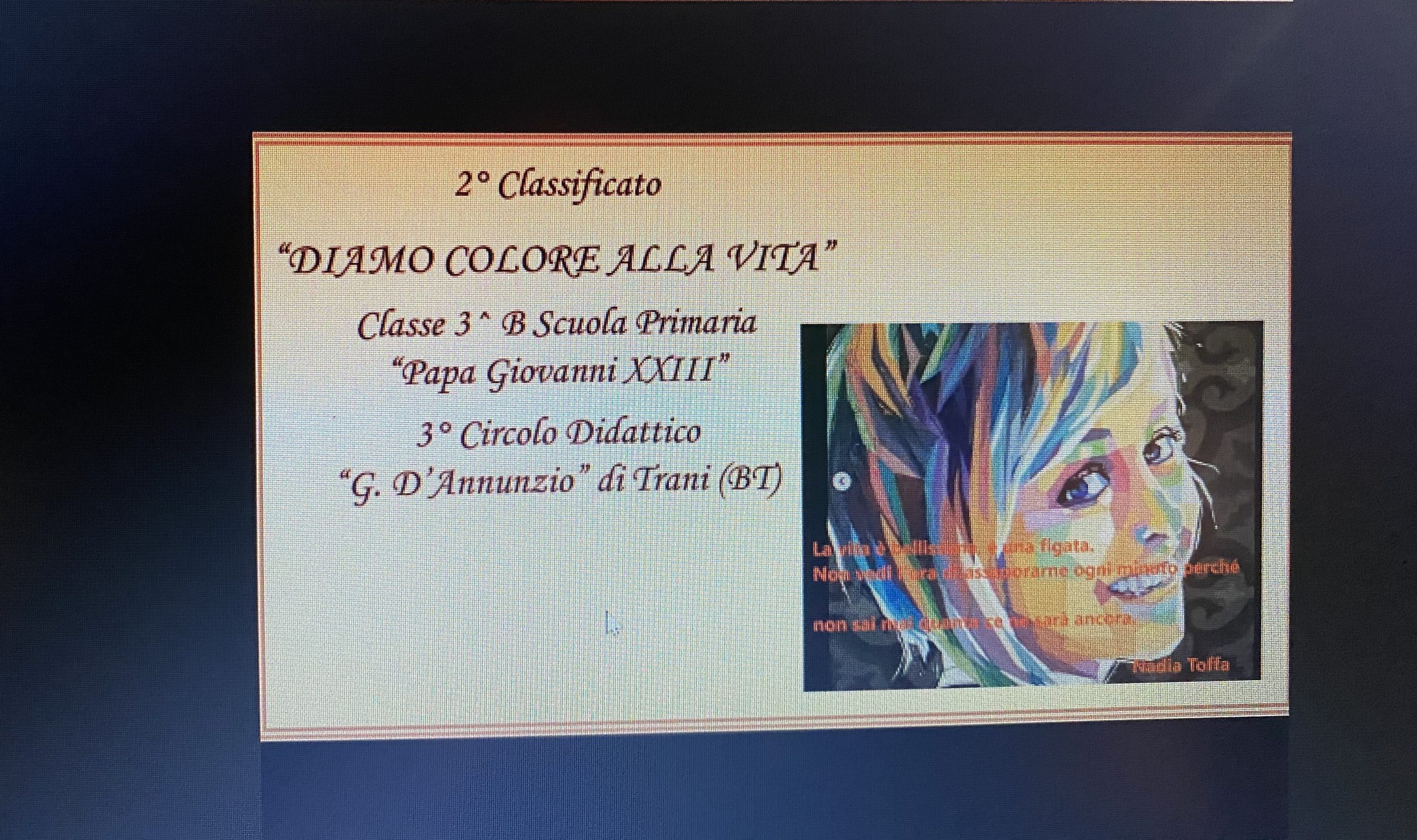 Tra i vincitori dell’edizione 2019/2020 la classe 3^ B, ora 4^ B, della scuola primaria “Papa Giovanni XXIII” del 3^ Circolo didattico “G.D’Annunzio”, premiata nel pomeriggio del 28 ottobre in modalità a distanza per un elaborato multimediale realizzato dalle alunne e dagli alunni al termine di un percorso volto a rafforzare il sentimento della gioia, a riaprire i canali emotivi del piacere di vivere con se stessi e con gli altri, a riscoprire tutti i colori presenti nella nostra quotidianità, anche quando diventa piu’ difficile individuarli.