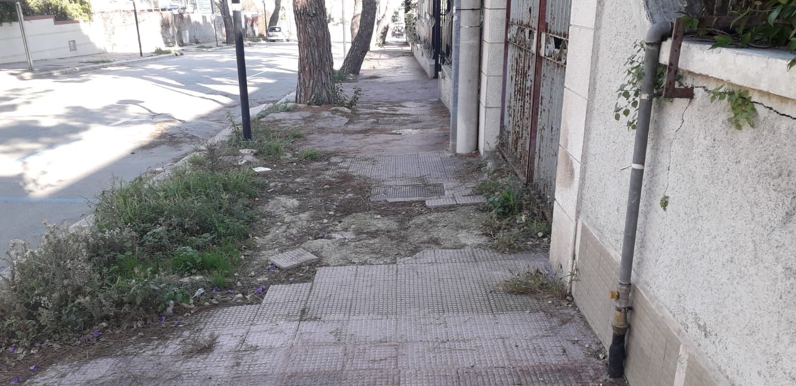 Come si nota dalle foto, in alcune parti manca totalmente la pavimentazione, in altre il marciapiede è sconnesso a causa delle radici dei pini che hanno provocato anche danni sulla carreggiata.