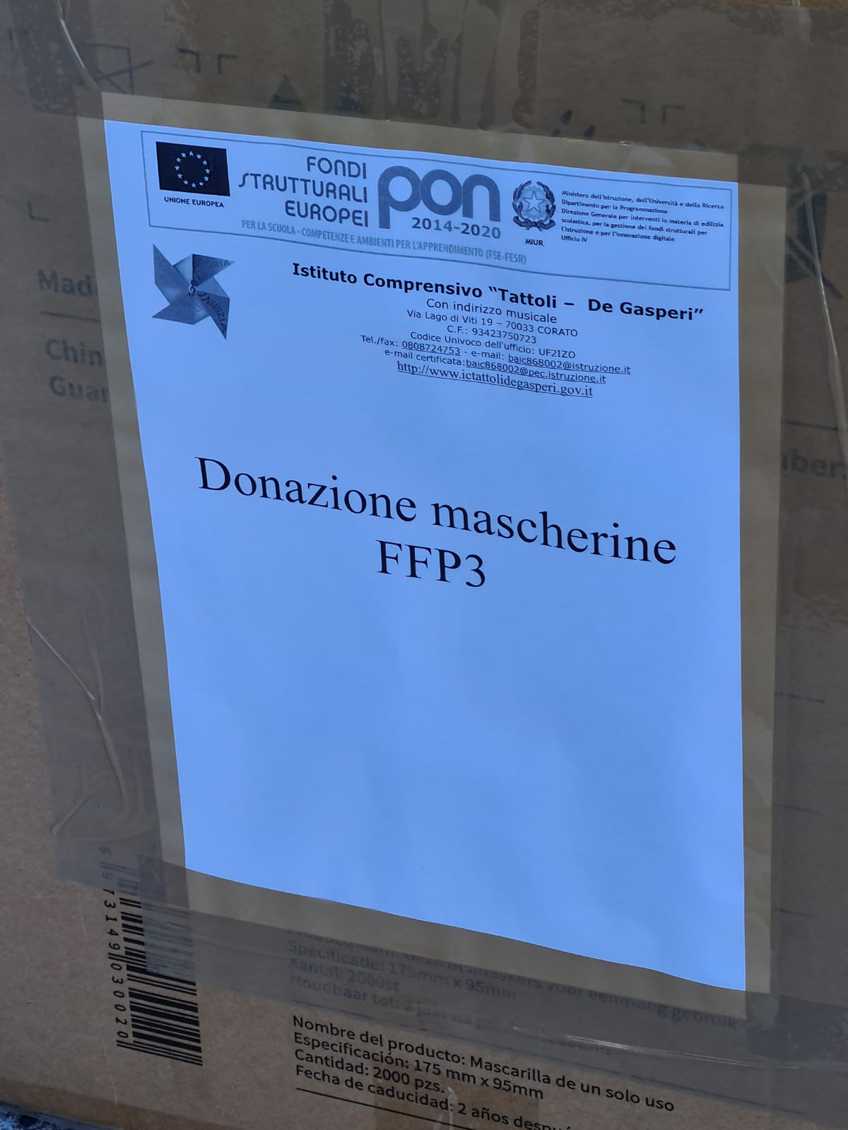 Oggi alle ore 10 presso l'ospedale Vittorio Emanuele di Bisceglie saranno donati 1700 euro convertiti in 700 dpi FFP3 al Covid Hospital, frutto dell'iniziativa "Gener-azioni positive", raccolta no profit dell'Istituto Comprensivo Tattoli De Gasperi di Corato, con la collaborazione del coro polifonico Akathistos città di Trani del santuario parrocchia Madonna di Fatima di Trani, dell'Ass. Dil. Nuova Matteotti e della ditta Sa. Di. di Corato.