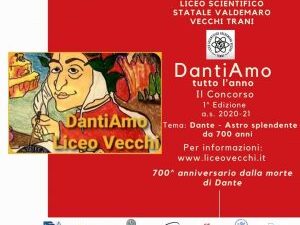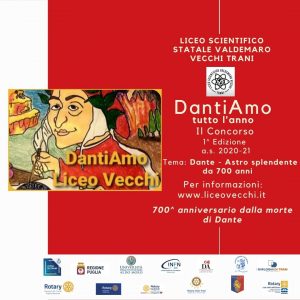 Per onorare il 700° anniversario dalla morte di Dante Alighieri, il Liceo Scientifico V. Vecchi di Trani indice la prima edizione del Concorso “DantiAmo tutto l’anno” che ha per tema “Dante - Astro splendente da 700 anni”. Il Concorso promuove la partecipazione di tutti gli studenti del Liceo Scientifico, i quali competono in una apposita sezione interna; prevede, altresì, una sezione esterna nella quale possono concorrere gli studenti di tutte le scuole secondarie di Puglia ( primo grado, cat. A - secondo grado, cat. B) nonchè gli studenti universitari e neolaureati residenti in Puglia (cat. C), con elaborati inediti di diversa tipologia, ispirati al tema dantesco, da inoltrare alla Scuola entro il 27 Febbraio 2021.