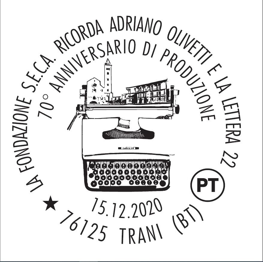 La cattedrale e palazzo Lodispoto impresse su un foglio che idealmente spunta dal rullo della mitica Lettera 22. È questo il disegno contenuto nell'annullo filatelico che domani, martedì 15 dicembre, sarà rilasciato proprio presso quello stabile, in piazza Duomo, a cura di Poste italiane e Fondazione Seca, in occasione del settantesimo anniversario della produzione di una delle più famose macchine per scrivere della storia del Paese, strettamente intrecciata con il nome di Adriano Olivetti.