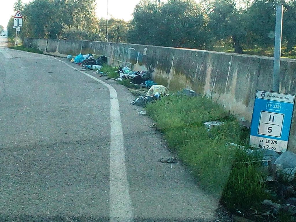 C'è tanta rabbia nel cittadino che ci ha trasmesso le foto, che qui alleghiamo, con riferimento alla trasformazione in discarica a cielo aperto di alcune aree di sosta e sedi periferiche delle carreggiate di strade extraurbane. Ci troviamo, in particolare, sulla ex strada provinciale 238, oggi Sp 12 Trani-Corato, lungo la quale il manto stradale in alcuni punti è disseminato di un numero ingente di rifiuti.