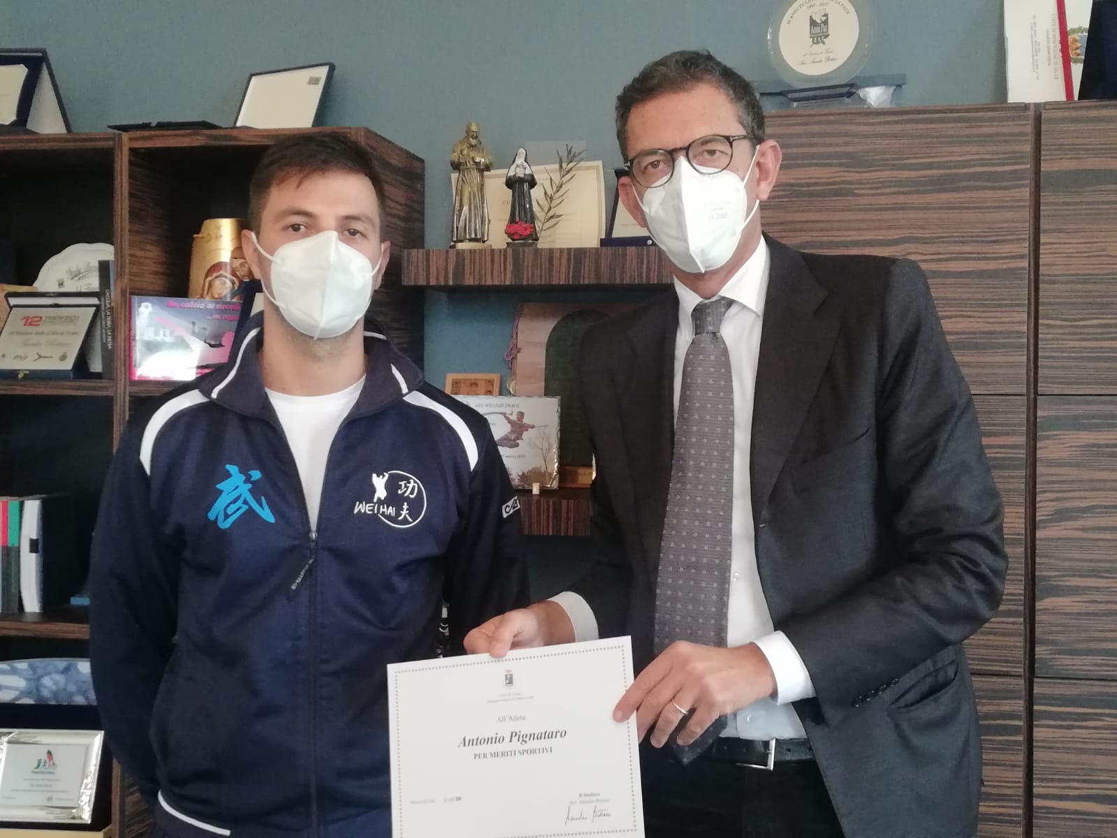Il sindaco di Trani, Amedeo Bottaro, ha conferito questa mattina un attestato di merito all'atleta tranese Antonio Pignataro, maestro di arti marziali cinesi dell’associazione “Wei Hai” di Trani, insignito di recente della medaglia di bronzo al valore atletico per l’anno 2019 a seguito dei risultati ottenuti ai campionati europei di Mosca.